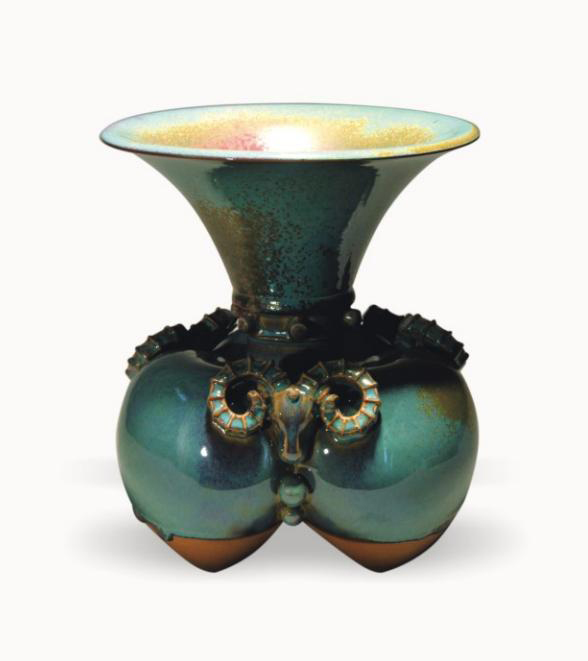 《三阳开泰》以青铜器尊为基本造型,上部张开,线条流畅,下部圆润他满,三个造型夸张的羊首装饰其中。螺旋状的羊角,象征福气延绵不绝,长长久久。新愿人们在羊年否极泰来,事事顺心,美满幸福。